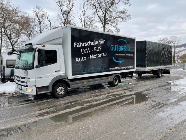 Unser Mercedes Atego 818 hat viele Geschwister in den unterschiedlichsten Einsatzzwecken. Im Verteilerverkehr für Speditionen, Möbelhäuser, Getränkehändler, Schreinereien,... überall findet man die leichte Klasse der Mercedes Lkw. Mit einer zulässigen Gesamtmasse von 7,49 Tonnen verfügt unser kleiner Laster über einen luftgefederten Fahrersitz, Klimaanlage und Ladebordwand am Möbelkoffer. An die Anhängerkupplung lässt sich unser Starrdeichselanhänger befestigen und schon sind wir eine Klasse weiter, nämlich bei C1E. Ab 18 Jahre und mit Vorbestitz der Klasse B kann es losgehen.